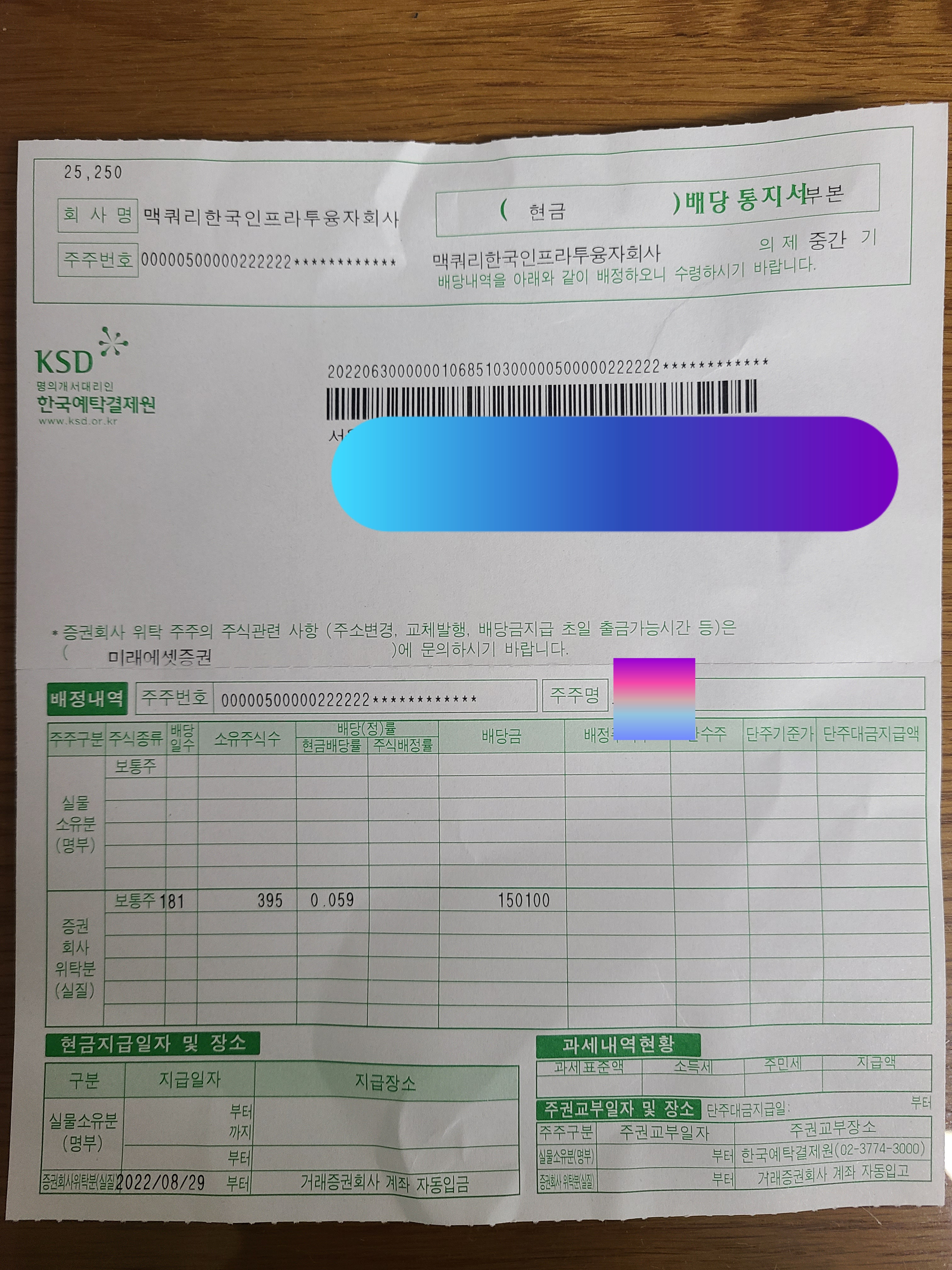 오늘 퇴근할 때 보니, 우편함에 한국예탁결제원에서 보내온 배당통지서가 와 있더라구요.